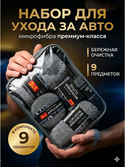 Мою машину сам каждые 2 недели — на автомойке царапают ЛКП жёсткими щётками. Старые тряпки из микрофибры стали жёсткими после 20 стирок, оставляют разводы на стекле. Заказал набор на Wildberries — привлекла комплектация из 9 предметов в одной сумке.