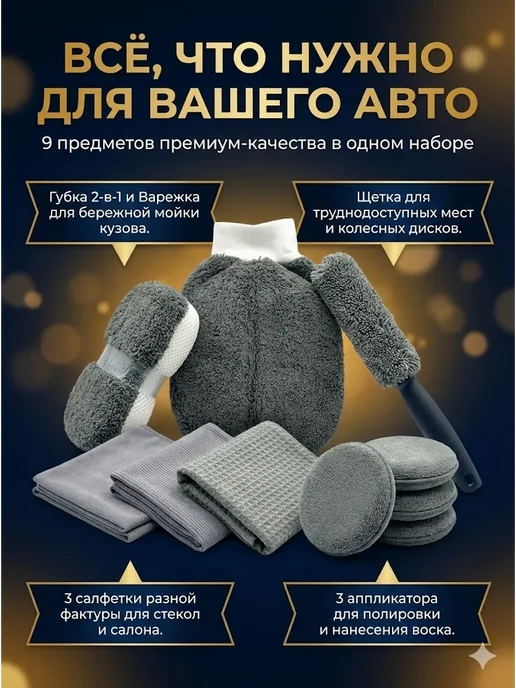 Тестирую премиум-набор из 9 предметов: варежки, губки, аппликаторы и салфетки. Обещают идеальную мойку без разводов и вреда для ЛКП. Работает ли на практике или просто красивый комплект?