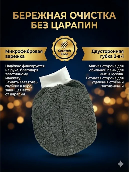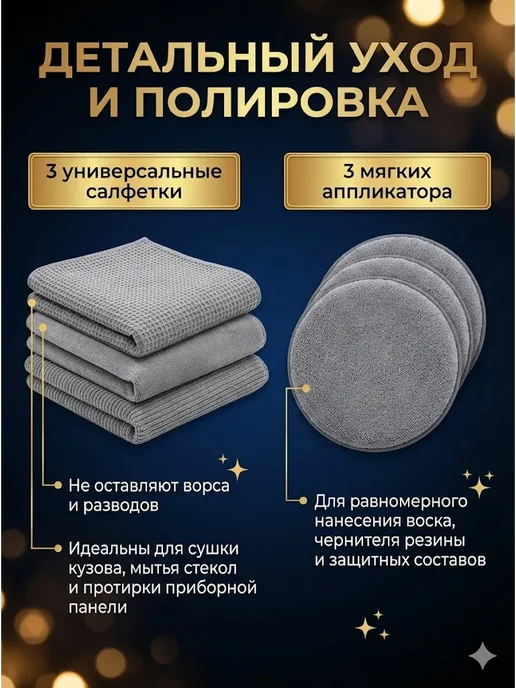 Варежка не царапает ЛКП — мягкий ворс бережно снимает грязь. Салфетки впитывают без разводов — три прохода и поверхность сухая. Микрофибра выдерживает стирки — после 8 циклов свойства сохранились. Комплектация 9 предметов — всё в одной сумке, не нужно искать отдельно. Цена — дешевле покупки предметов по отдельности.