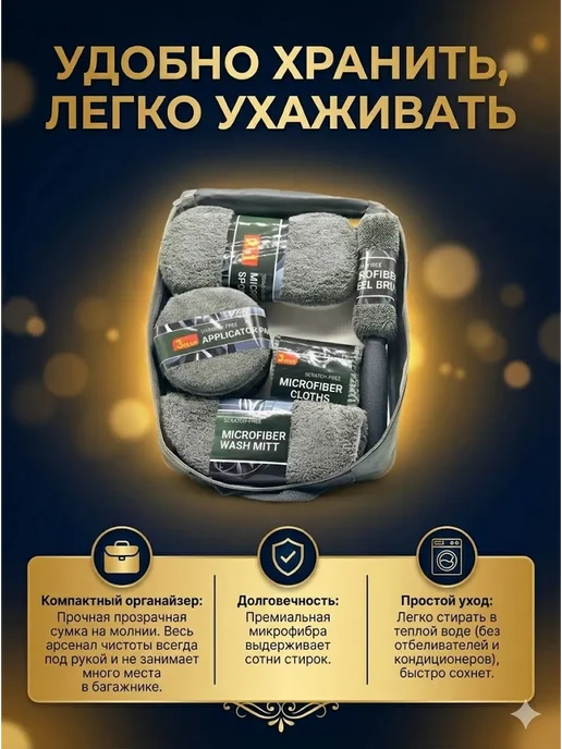 Для автовладельцев, моющих машину сам — весь набор в одной сумке. Для новичков в детейлинге — базовый комплект для старта. Для подарка автомобилисту — красивая упаковка, практичный набор.