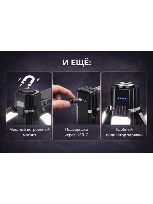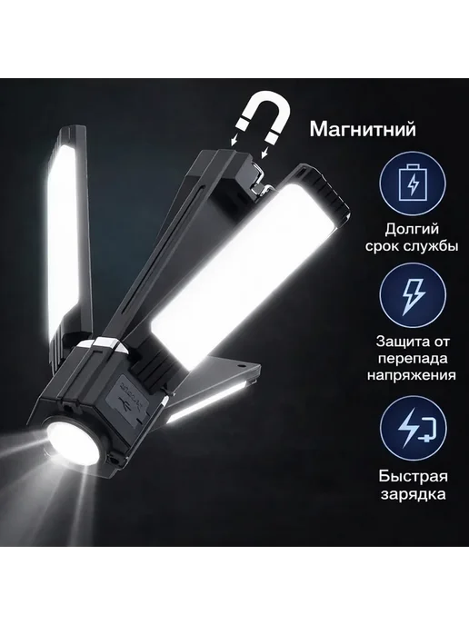 Магнит держит фонарь на металле крепко — не отваливается при вибрации, наклонах. Три режима яркости позволяют выбрать нужный — от яркого 100% до экономичного 30%. Время работы 6-8 часов на среднем режиме — достаточно для ночи в походе или длительного отключения света. Трансформер удобен — можно использовать как ручной фонарь, настольную лампу или кемпинговый светильник. Функция powerbank работает — можно зарядить телефон на 30-50% в экстренной ситуации.