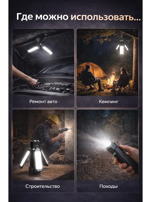 Для владельцев частных домов и дач — аварийное освещение при отключениях света. Для туристов и рыбаков — кемпинговый фонарь с долгим временем работы. Для автовладельцев — рабочий светильник для ремонта в гараже с магнитным креплением. Для строителей и ремонтников — портативный прожектор для работы в тёмных помещениях.