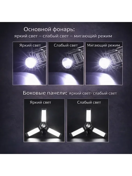 Одно короткое нажатие кнопки — включается COB-панель на 100% яркости. Светит ярко белым холодным светом, освещает комнату 12 квадратных метров полностью — читать книгу, готовить еду, работать за столом комфортно. Второе нажатие — COB-панель переключается на 50% яркости. Свет мягче, приятнее для глаз, для фонового освещения достаточно. Третье нажатие — включаются три точечных LED-диода. Свет направленный узким лучом — светит вперёд на 15-20 метров, подходит для освещения конкретной зоны или как обычный фонарик. Четвёртое нажатие — точечные LED переключаются в режим стробоскоп, мигают часто. Пятое нажатие — фонарь выключается. Если держать кнопку 3 секунды в любом режиме, включается COB-панель на 30% яркости — экономичный режим для ночника.