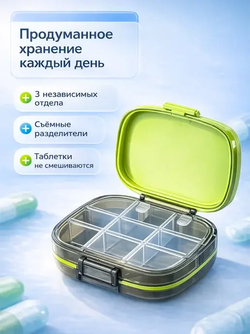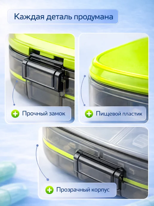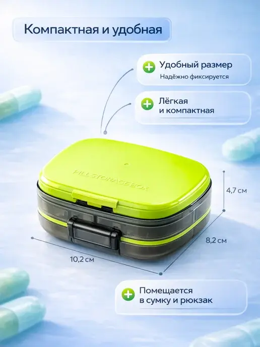 В поездку брала с собой — в сумке не открылась, таблетки не перемешались, не размокли даже в дождь. Компактная, легко помещается в косметичку или карман. Для витаминов и лекарств — идеально.