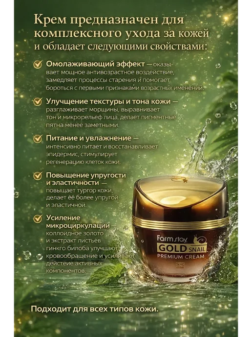 Премиальный уход для кожи лица и зоны декольте представлен в изысканной баночке с плавным переходом цвета от глубокого коричневого к прозрачному, что придает средству элегантный вид и подчеркивает роскошный дизайн. Золотистые акценты на крышке и упаковке гармонично сочетаются с названием, отражая содержание ингредиентов gold и snail. Материал упаковки — прочный пластик с глянцевой текстурой, приятный на ощупь и устойчивый к повреждениям. На коробке и баночке нанесена четкая инфографика, указывающая на основные преимущества: выравнивающий и сияющий эффект, интенсивное увлажнение и поддержание кожного барьера.Средство подходит для дневного и ночного использования, а также для восстановления кожи любого возраста, включая зрелую, возрастную и чувствительную. Крем обладает легкой текстурой, легко распределяется, быстро впитывается, не оставляя липкости и создавая ощущение мягкости. Благодаря входящим в состав муцину улитки, gold, peptide, niacinamide и collagen, средство способствует лифтингу, повышению упругости и восстановлению эластичности кожи, а также помогает бороться с мимическими морщинами, пигментации и признаками age. Увлажняющий и питающий комплекс помогает сухой, комбинированной и проблемной коже, способствует восстановлению после стресса и внешних воздействий.Корейская уходовая косметика отличается гипоаллергенной формулой, подходит для ежедневного применения и рекомендована для женщин любого возраста, включая девушек, маму, бабушку, сестру или подругу. Такой beauty-продукт станет отличной идеей подарка для жены, коллеге или на юбилей, день рождения, 8 марта, 23 февраля, новогодний праздник или просто как знак заботы. Благодаря комплексу anti-age и восстанавливающему действию, крем способствует восстановлению тонуса, уменьшению морщин и выравниванию тона, делая кожу более сияющей и ухоженной.