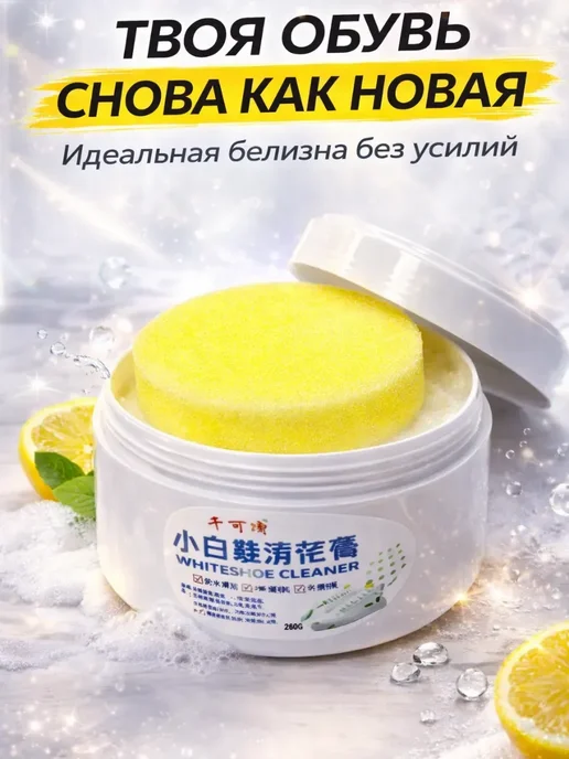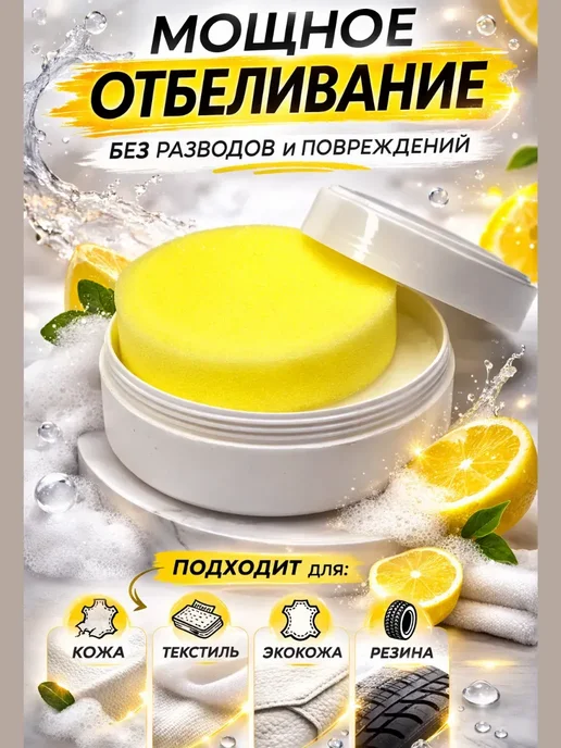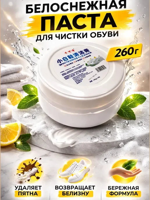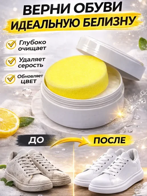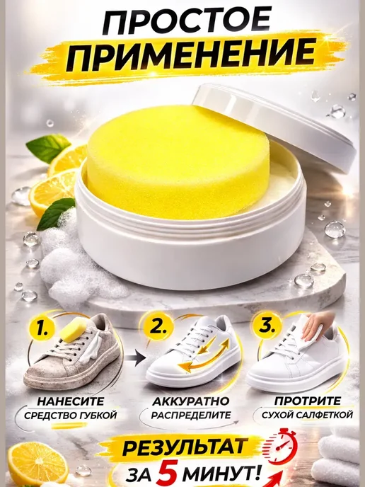 За 3 минуты убирает жёлтость с экокожи и текстиля — возвращает белый цвет. Резину отбелила идеально ровно — подошва как новая без серости. Густая паста не стекает — можно наносить точечно на пятна. Экономичный расход — 100 мл хватает на 20 чисток пары обуви. Лимонный запах быстро выветривается после смывания.