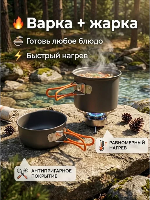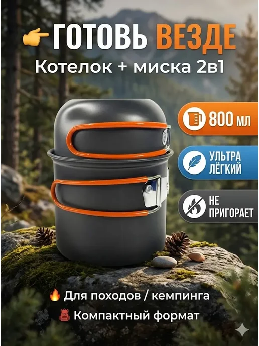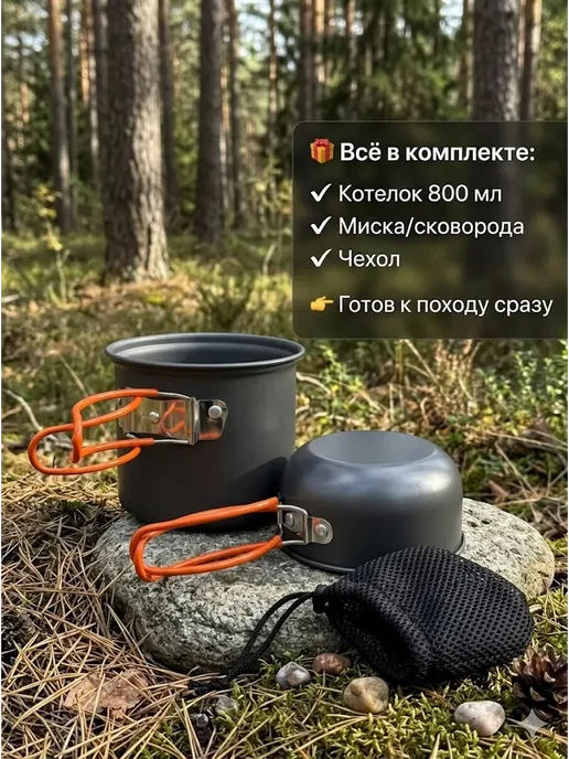 Разбираю ультралёгкий набор для кемпинга: котелок 800 мл, миска-сковорода и чехол. Складывается компактно, не пригорает, весит всего 210 грамм. Тест на практике — стоит ли брать в лес?