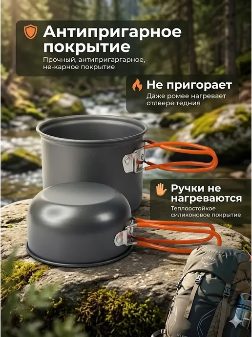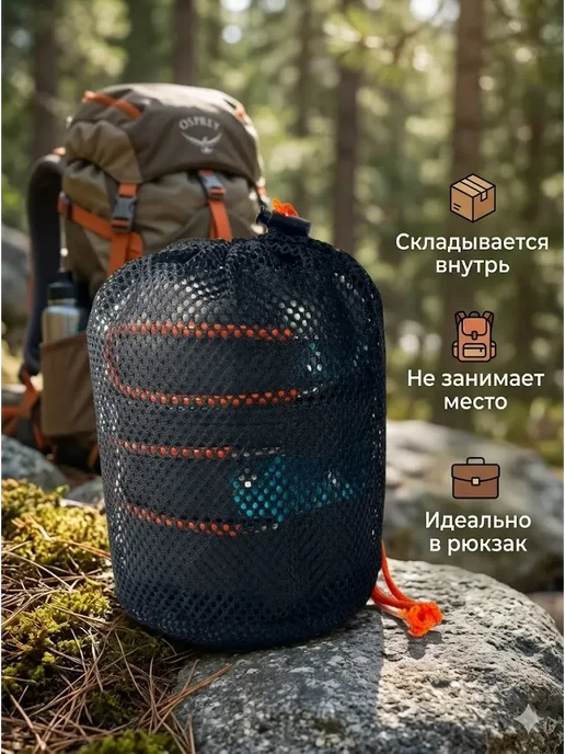 210 грамм легче флягой воды — не чувствуется вес в рюкзаке, идеально для легкохода. Матрешка занимает места минимум — высота 9 см поместилась в боковой карман рюкзака. Антипригарное покрытие работает отлично — каша и яйца не прилипают, моется легко. Вода кипит быстро — 4-6 минут на горелке благодаря тонкому дну. Чехол защищает рюкзак от сажи — ткань плотная водонепроницаемая.