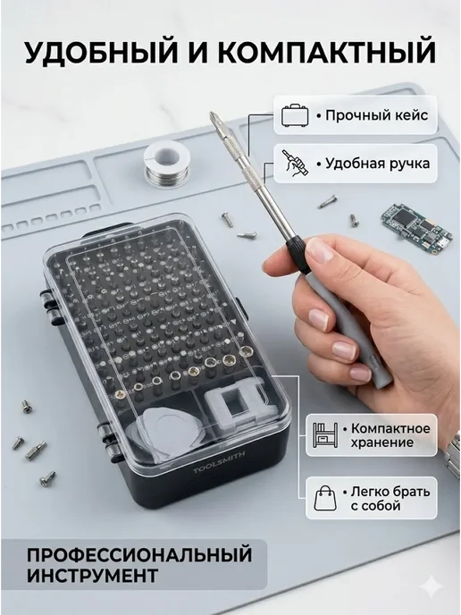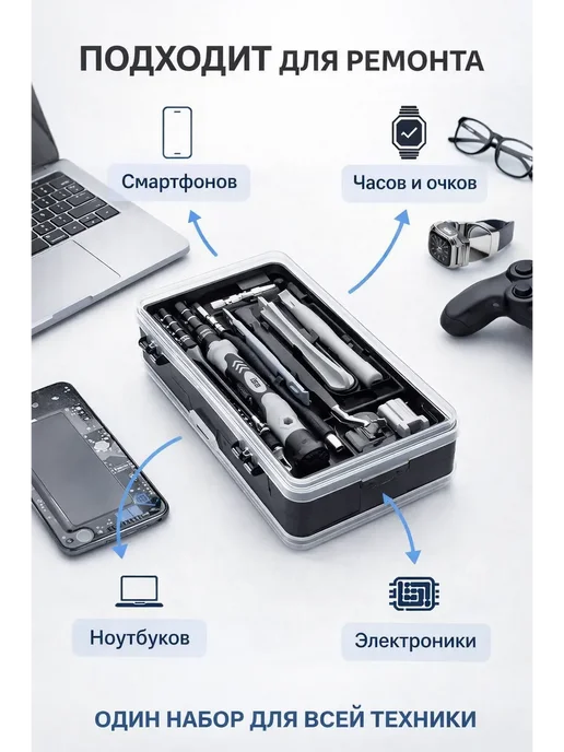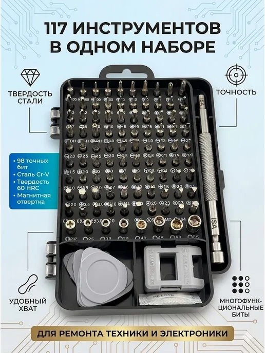 Занимаюсь ремонтом гаджетов для себя и знакомых — меняю экраны на телефонах, чищу ноутбуки от пыли, разбираю часы. Раньше пользовался разрозненными отвёртками — где-то крестовая, где-то шестигранник, для iPhone отдельная пятиконечная. Постоянно что-то терялось, не хватало нужного размера. Решил купить универсальный набор. Выбрал набор 117 в 1 на Wildberries за 890 рублей — видел положительные отзывы, много бит, есть все необходимые инструменты.