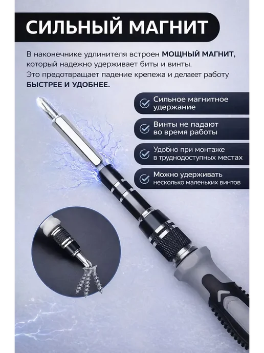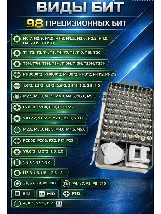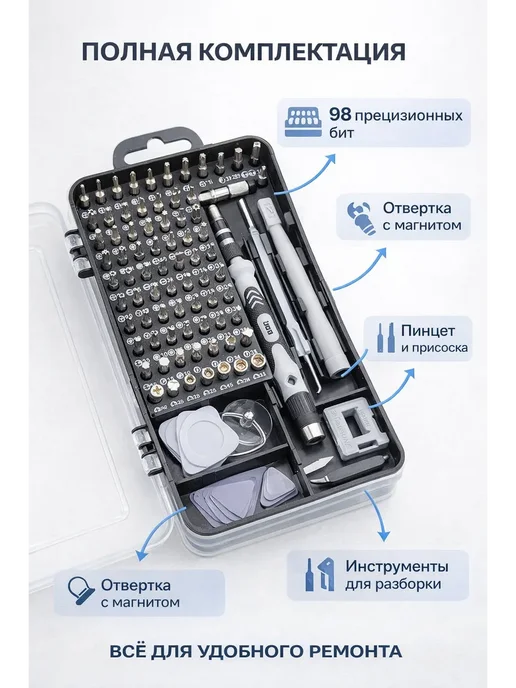 Всё в одном месте — 98 бит плюс инструменты, не нужно искать по ящикам. Большой выбор типов и размеров — подходит для 95% техники. Магнитные биты — винтики не падают, удобно работать. Компактный кейс — легко хранить и брать с собой. Ручка удобная — алюминиевая, с противоскользящим покрытием. Удлинители — обычный и гибкий для труднодоступных мест. Дополнительные инструменты — пинцет, присоска, медиаторы, ключ для SIM. Маркировка на битах — видно тип и размер. Намагничиватель/размагничиватель — можно намагнитить обычную отвёртку. Доступная цена — 890 рублей за полный комплект. Подходит для большинства гаджетов — iPhone, Samsung, Xiaomi, ноутбуки, часы.