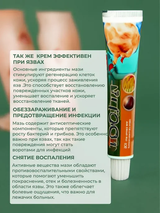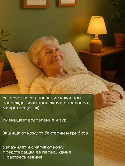 Крем-мазь от пролежней разработана для взрослых и лежачих больных, которым требуется эффективная помощь при уходе за кожей. Средство помогает снизить риск образования пролежней, а также облегчить состояние уже поврежденных участков. Формула сочетает регенерирующий, заживляющий и защитный эффекты, идеально подходит для чувствительной и сухой кожи. Мазь способствует быстрому восстановлению кожных покровов и препятствует развитию трофических язв, экземы, раздражения и шелушения.В состав продукта входят питательные компоненты, которые обеспечивают глубокое увлажнение и питание. Благодаря входящему в состав вазелину и глицерину создается барьер против покраснений, опрелостей и повреждений. Также средство подходит для ухода за кожей после длительного контакта с подгузником, урологическими прокладками или судном, помогая избежать дискомфорта и неприятного запаха пота.Рекомендуется для медицинского и лечебного применения в уходе за пожилыми, подростками, людьми после операций, а также для женщин и мужчин. Использование возможно в комплексе с матрасом противопролежневого действия, для дополнительного ухода после мытья тела или массажа. Подходит при дерматите, акне, постакне, экземе, псориазе и воспалениях. Способствует заживлению ран, ожогов и уменьшает выраженность шелушения, устраняет чрезмерную сухость кожи.Косметика на основе натуральных ингридиентов и витаминов обеспечивает полноценный уход и регенерацию для комплексной поддержки кожного барьера. Продукт подходит для профилактики и устранения раздражения, увлажнения комбинированной, проблемной и жирной кожи. Защитное воздействие мази актуально после использования пластыря, присыпки, приспособлений для педикюра, маникюра, а также при уходе за ногами, лицом, руками.Рекомендовано при грибке, покраснениях, точках и иных признаках дискомфорта, что актуально для лежачих людей и подростков с проблемной кожей. После применения поддерживается ощущение мягкости, уходит зуд, снижается риск появления боли и трещин.боли и трещин.