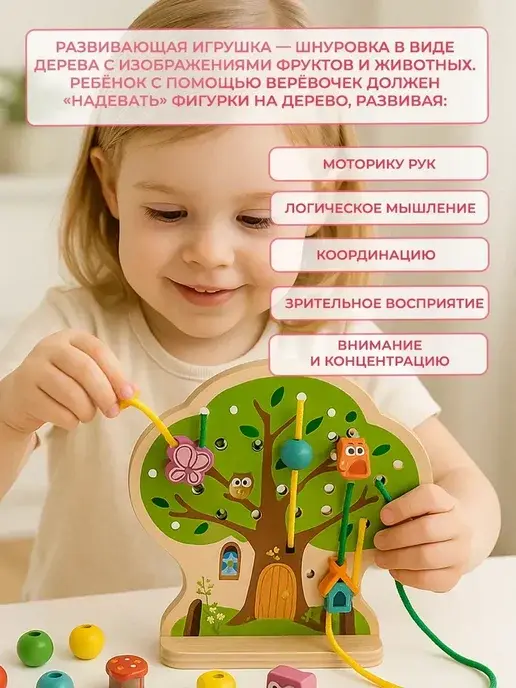 Как мама двоих детей, я всегда ищу игрушки, которые не просто развлекают, а реально развивают. Увидела в Wildberries деревянную шнуровку «Волшебное дерево» — цена приятная, отзывы хорошие, заказала. Хочу поделиться честным мнением после двух месяцев использования с дочкой 3,5 лет.