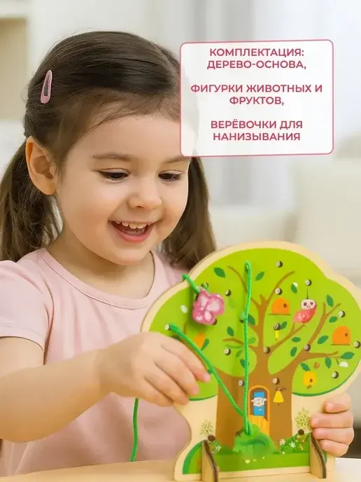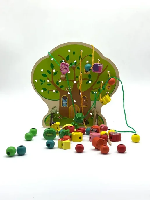 В наборе: деревянное основание в форме дерева с отверстиями, несколько деревянных элементов (фрукты, листики, животные — зависит от модели), цветной шнурок с деревянным наконечником. Все детали из натурального дерева — приятные на ощупь, с лёгкой шероховатостью, что дополнительно стимулирует тактильные ощущения. Краски яркие, но не ядовитые — на водной основе, без запаха. Размер деталей идеальный для детских ручек — не слишком мелкие, держать удобно.