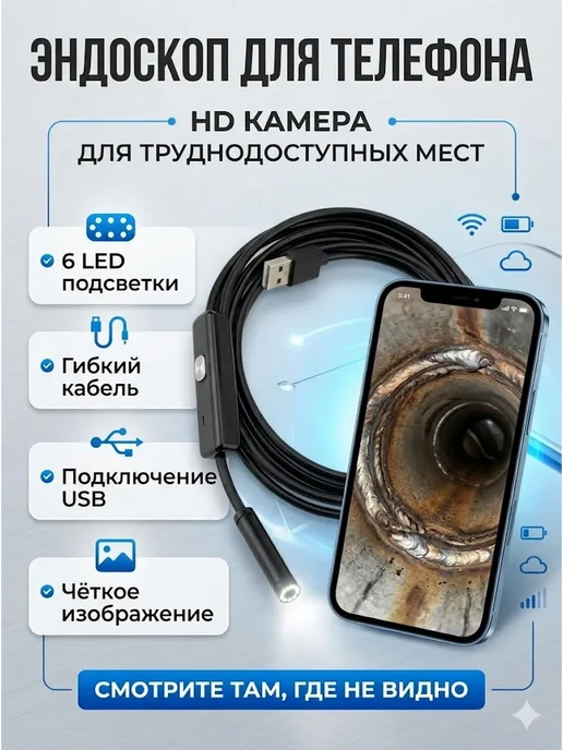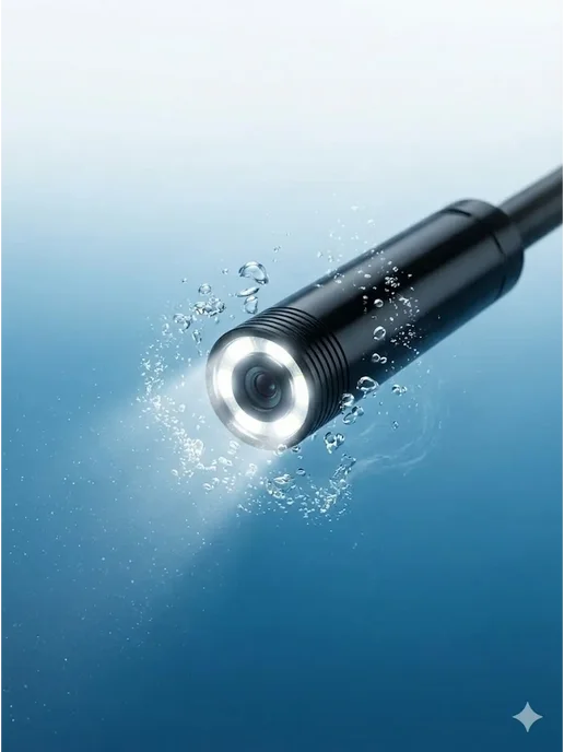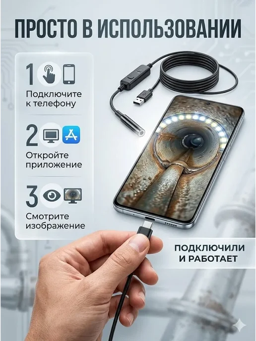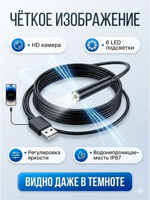 Видит в темноте — 6 LED-подсветок с регулировкой яркости. Водонепроницаемый IP67 — в воду можно, в канализацию тоже. HD-камера — разрешение 1280×720p, картинка чёткая. Длинный кабель 2 метра — достаёт глубоко. Жёсткий кабель — держит форму, удобно для труб. Подключение к телефону — видишь на большом экране сразу. Приложения бесплатные — USB Camera Viewer, AN Camera. Насадки в комплекте — крючок, магнит, зеркальце. Универсальный разъём — USB Type-A и micro-USB через адаптер. Доступная цена — 680 рублей за функционал. Компактный — удобно хранить, брать с собой.