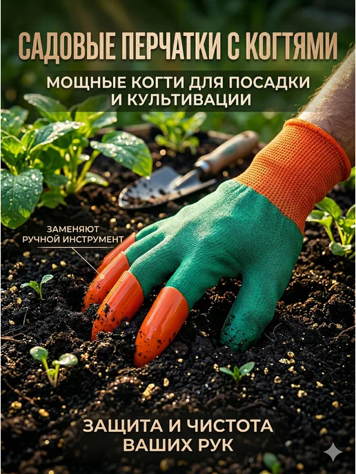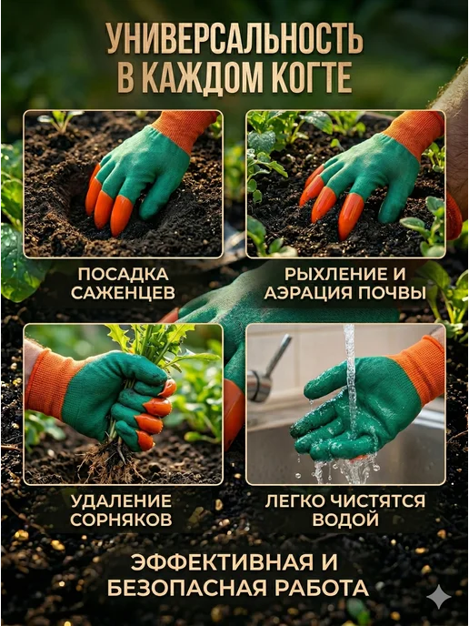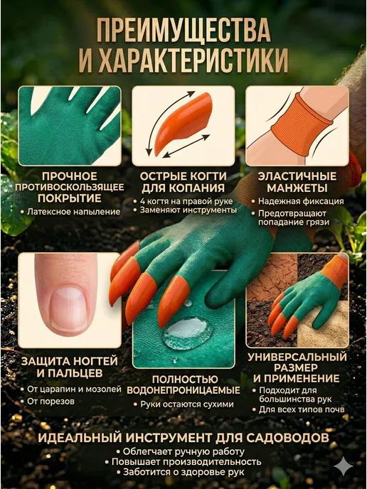Рыхлят землю быстрее маленькой тяпки руками — грядку 4 метра междурядье разрыхлила за 10 минут вместо обычных 15 минут с железным инструментом тяжёлым. Грязь не проникает внутрь совсем никак — латекс водонепроницаемый плотный руки после 2 часов работы чистые сухие как до начала работ. Когти пластиковые крепкие не слетают намертво — вшиты качественно в ткань между двумя слоями держатся при любых нагрузках вытаскивание корней. Универсальный размер подходит всем — обхват ладони 19-23 см мне женщине и мужу мужчине налезли нормально удобно. Лёгкие всего 95 грамм вес — руки не устают совершенно за час интенсивной работы копания прополки в отличие от резиновых тяжёлых.