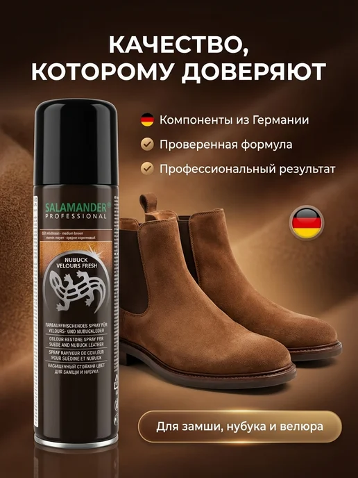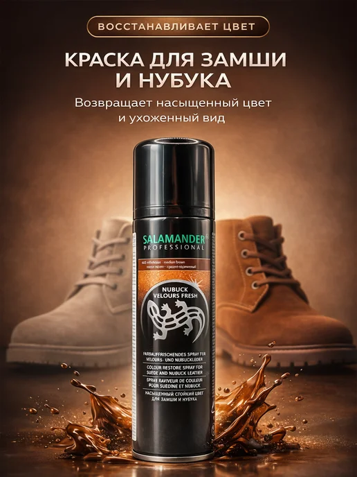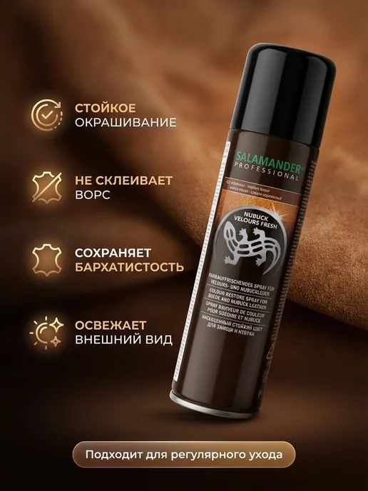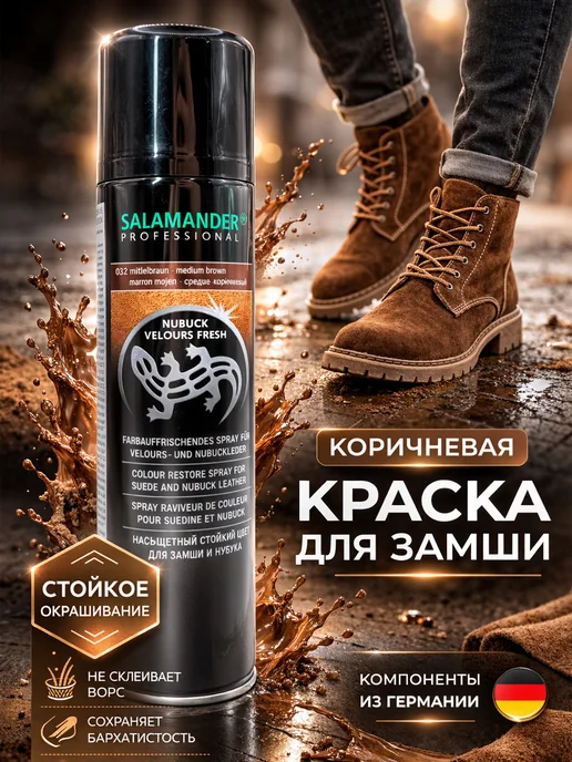 Восстанавливает выцветший цвет — серо-коричневая замша становится насыщенной. Закрашивает белесые пятна и потертости — даже сильно затертые участки покрываются равномерно. Водоотталкивающий эффект — после покраски обувь не боится дождя и слякоти. Стойкая краска — держится месяцами без потери цвета. Немецкое качество — Salamander Professional, проверенная марка. Богатая палитра цветов — можно подобрать под любую обувь. Удобный аэрозоль — равномерное распыление, легко наносить. Не склеивает ворс — замша остается мягкой и бархатистой. Большой объём — 250 мл хватает на 4-5 пар обуви.