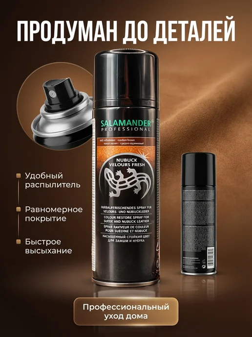 Профессиональная краска-аэрозоль для замши и нубука в металлическом баллончике. Цвет средний коричневый, насыщенный. Консистенция жидкая, распыляется облаком. Запах химический, очень резкий и токсичный — работать можно только на открытом воздухе или балконе. В составе акриловая краска, водоотталкивающие компоненты. Флакон с удобным распылителем, не забивается. На баллоне инструкция на нескольких языках, включая русский. Производитель Salamander Professional — немецкая марка, которой доверяют профессионалы.