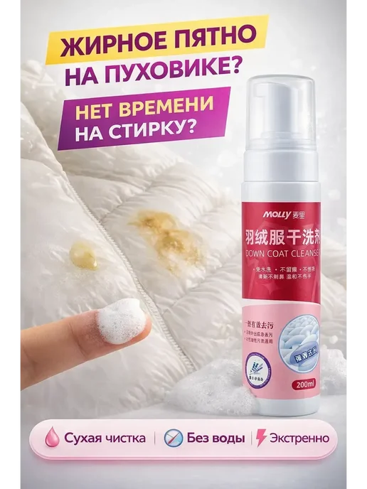 Зимой пуховик носишь постоянно, и пятна появляются неизбежно. Воротник засаливается от кожи, манжеты пачкаются, случайно прислонилась к чему-то грязному — и вот уже след на рукаве. Стирать пуховик каждый раз из-за одного пятна — головная боль: пух сбивается, сохнет долго, потом расправлять приходится. В химчистку тоже не набегаешься — дорого и время уходит. Увидела на Wildberries эту пену MOLUY — китайская, недорогая (около 600 рублей за 200 мл), обещает сухую чистку без воды. Решила попробовать.