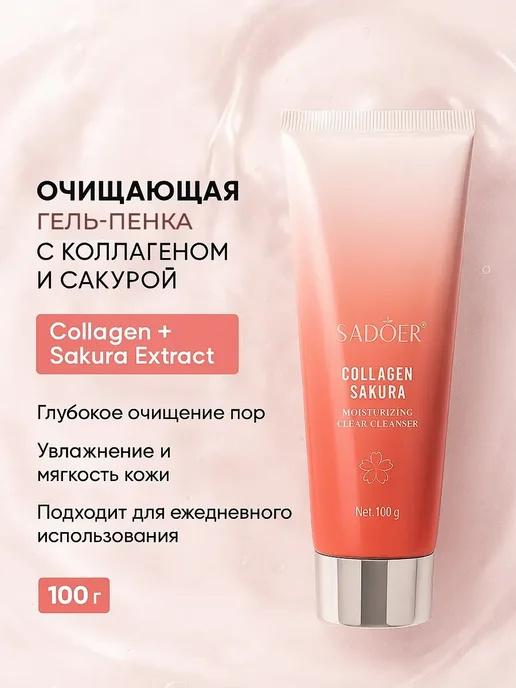 Давно искала хорошую, но недорогую пенку для умывания, которая будет и очищать, и не сушить кожу. На Wildberries наткнулась на Sadoer Collagen Sakura и решила попробовать — уж очень красивая упаковка и много положительных отзывов.