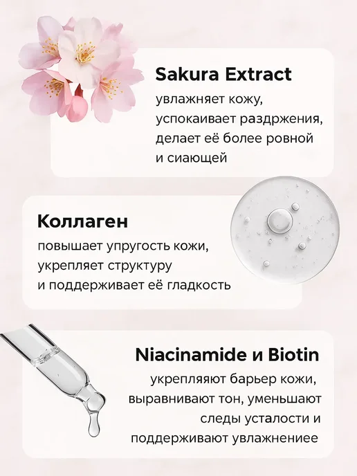 Умываюсь ей утром и вечером. Очищает отлично: снимает остатки макияжа, тонального крема, даже водостойкую тушь. Поры после неё выглядят чище, кожа гладкая и мягкая, без ощущения стянутости. Коллаген и экстракт сакуры действительно дают лёгкое увлажнение — кожа после умывания не требует сразу крем, чувствуется комфорт.