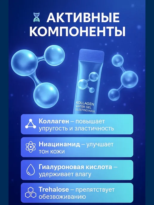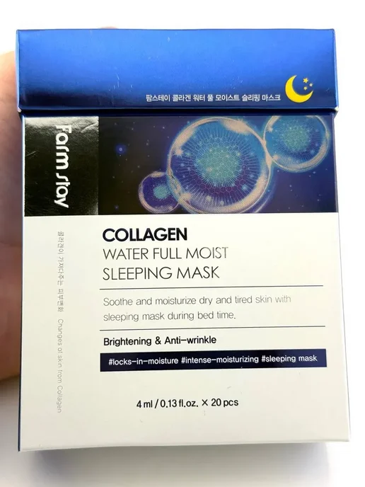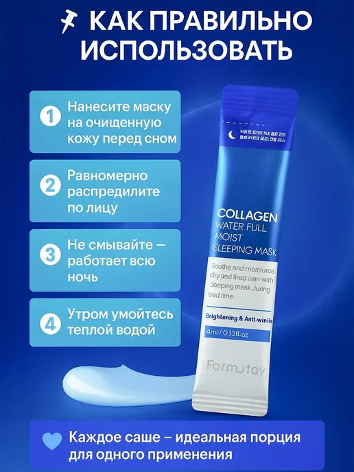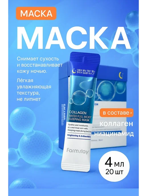 Это ночная маска с коллагеном. То есть, она работает пока мы отдыхаем. Коллаген — это строительный материал для кожи, и с возрастом его вырабатывается меньше. В результате кожа теряет упругость. Масками с коллагеном мы можем немного замедлить этот процесс.