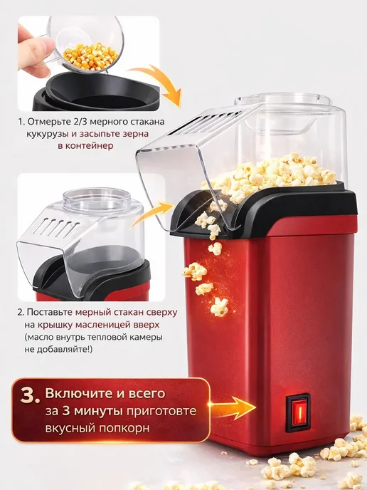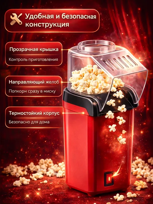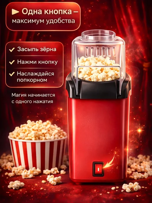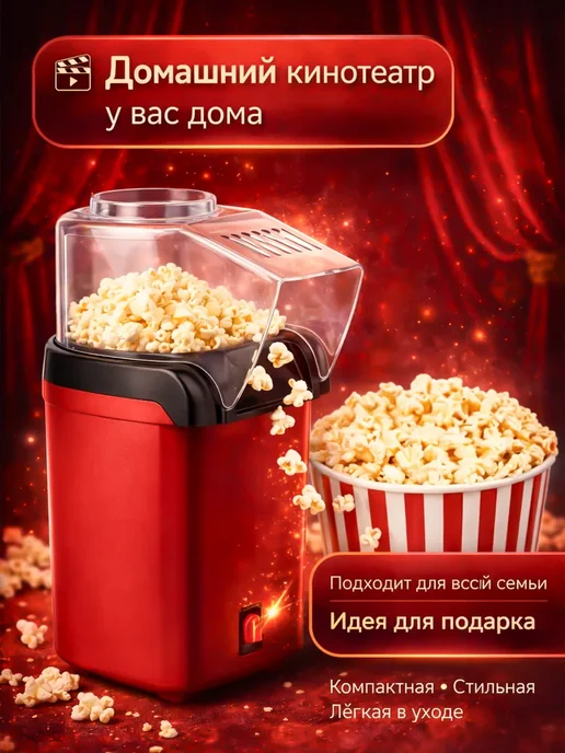 Попкорн — любимая вкусность для уютных вечеров. Эта машинка — современная попкорн машина, аппарат для быстрого приготовления попкорна дома. Домашний формат делает её идеальной для семьи, детей и взрослых. Электрическая попкорница работает по технологии hot air — горячий воздух равномерно прогревает зерна кукурузы без масла, жира и сахара, сохраняя полезный, диетический, низкокалорийный результат.Мощность 1200 Вт обеспечивает быстрый нагрев, а питание от сети 220 вольт делает устройство удобным для любой кухни. Это бытовая техника, созданная для простой готовки: простая система управления одной кнопкой, прозрачной крышкой и мерным стаканом позволяет контролировать процесс. Воздушный поток направляет готовый попкорма прямо в стакане или стаканчики, превращая процесс в настоящее шоу кино и кинотеатра дома.Компактная, мини, маленькая, но при этом большая по возможностям — эта попкорн машина подойдёт для вечеринки, дня рождения, просмотра фильмов или семейного кинотеатр-вечера. Легкая в уходе, красивая, красная, в стиле ретро, она станет эффектным акцентом среди кухонные принадлежности и вещи для дома.Это отличный подарок женщине, мужчине, подростку или ребенку — особенно как подарок на 8 марта. Подходит для сладких и солёных вариантов: сладкий, соленая, карамельный, с карамель, шоколад или другой добавка — делать вкусом можно на любой вкус. Профессиональный popcorn maker подойдёт тем, кто ценит качественные товары и новинки для покупки недорого, с хорошим соотношением цена и качества — это подтверждают отзывы.Отличный подарок на 8 марта для кухни маме, жене, любимой девушке, невесте, бабушке, дочери, сестре, внучке, тёте, коллеге, начальнице, преподавателю, воспитательнице, учительнице