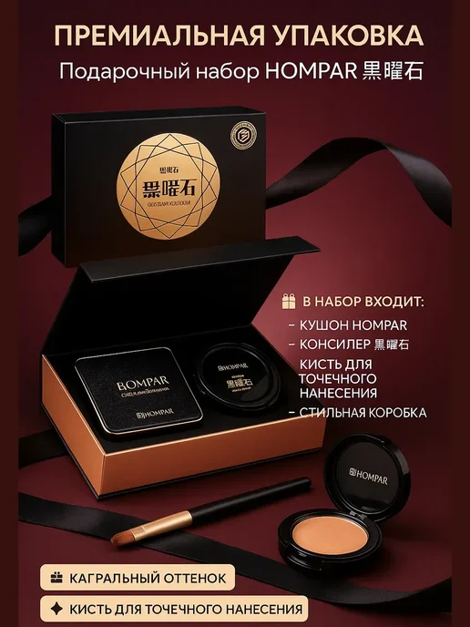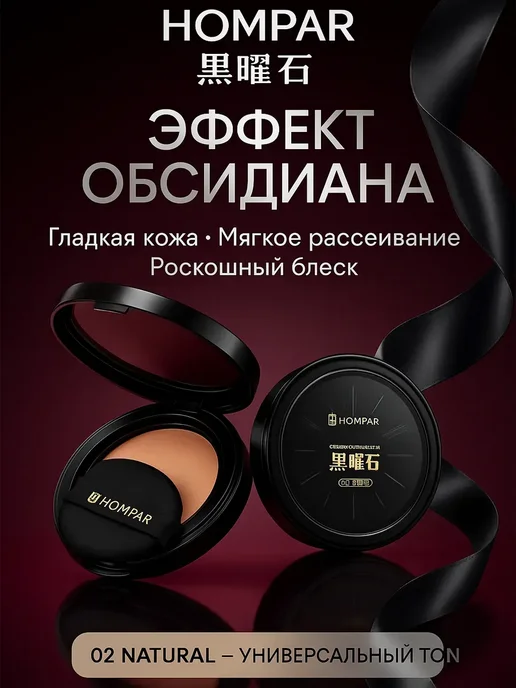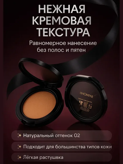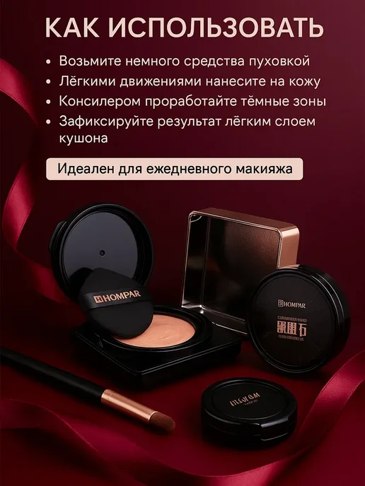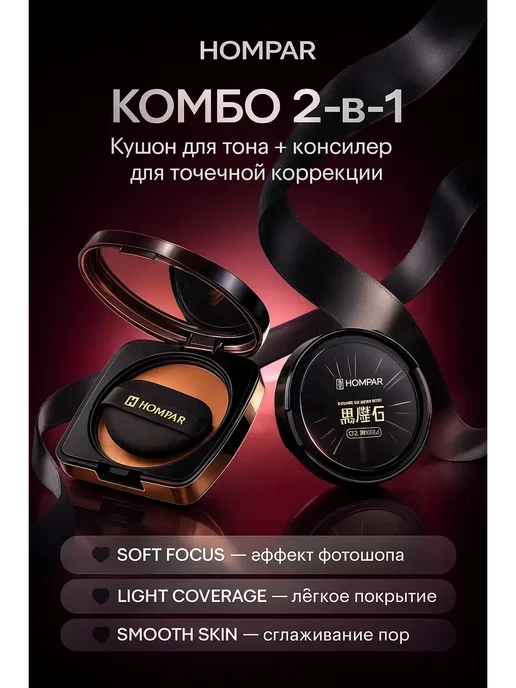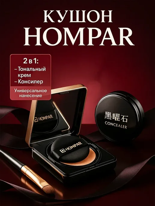 Я давно искала удобный и лёгкий тон, который не будет выглядеть маской, но при этом хорошо выравнивает цвет лица. На Wildberries наткнулась на набор HOMPAR Кушон + Консилер 2 в 1 и решила попробовать — уж очень красивые фото и много положительных отзывов.