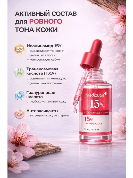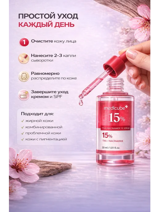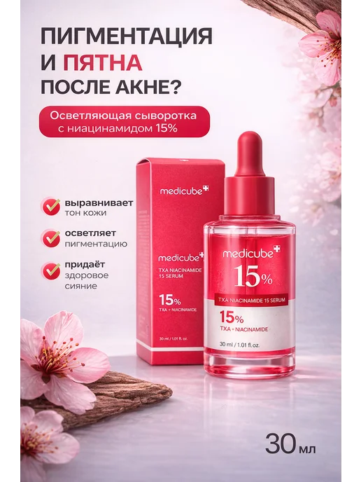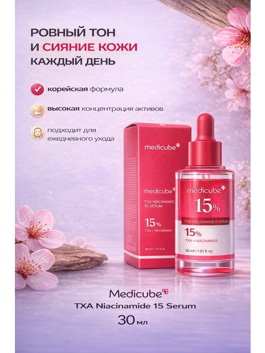 Мне 32, комбинированная кожа, проблема — постакне после прыщей и пигментные пятна на щеках от солнца. Пробовала разные осветляющие средства, но эффект был слабый или вообще никакой. Решила попробовать корейскую косметику с высокой концентрацией активов. Выбрала Medicube TXA Niacinamide 15% Serum на Wildberries за 1650 рублей. Объём 30 мл, производство Южная Корея.