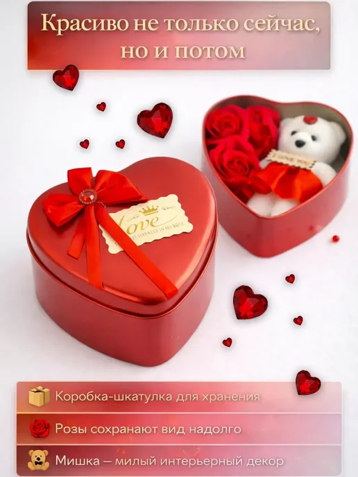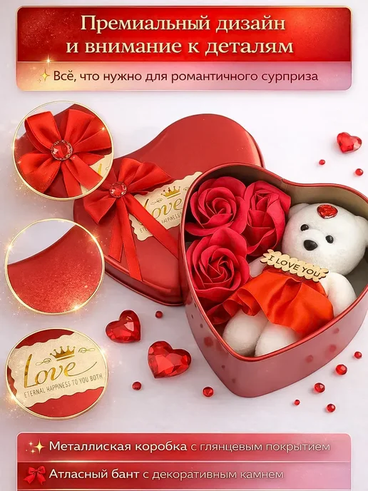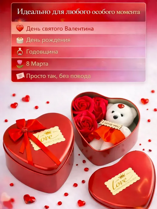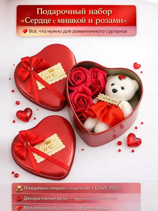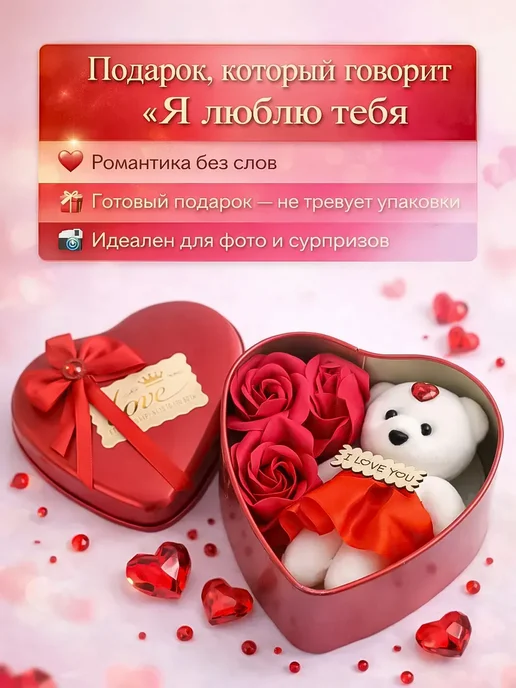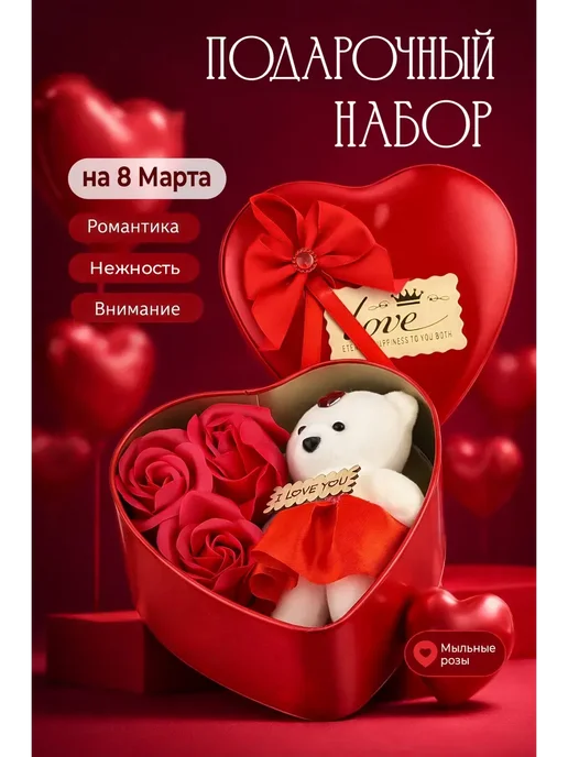 Подарочный набор на 8 марта — это красивый, универсальный подарок, созданный с заботой и вниманием к деталям. Такой подарочный бокс идеально подойдёт подруге, маме, любимой женщине, жене или дочке и поможет выразить чувства, заботу и внимание в весенний праздник.Набор оформлен в стильной металлической коробке в форме сердца. Эстетичная упаковка в красном и белом цвете создаёт праздничное настроение и делает презент полностью готовым к вручению. Внутри расположена аккуратная композиция: плюшевый мишка, декоративные розы и милые детали, создающие атмосферу нежности, романтики и уюта.Этот подарок дарит искренние эмоции, радость и счастье. Он подойдёт женщине любого возраста — от девочке и подростка до взрослому человеку. Такой сюрприз уместен не только на восьмое марта, но и на день рождения, годовщину или как знак внимания без повода.Набор выглядит оригинальный, стильный и фотогеничный, гармонично впишется в интерьер дома или спальню. Милый медвежонок и цветы символизируют любовь, а компактный формат мини делает этот подарочек удобным и практичным. Такой сувенир станет тёплым напоминанием о весне и искренних чувствах.лепестки мыла и мишка в подарочной железной коробке в форме сердца.Предназначение: Эти мыльные лепестки предназначены для использования в качестве ароматного средства для ванны или душа.Использование: Их можно добавлять в воду для создания пены и аромата во время принятия ванны или использовать как обычное мыло для мытья рук или тела.Дополнительно: Часто такие наборы используются в качестве декоративного элемента в ванной комнате или как романтический подарок.